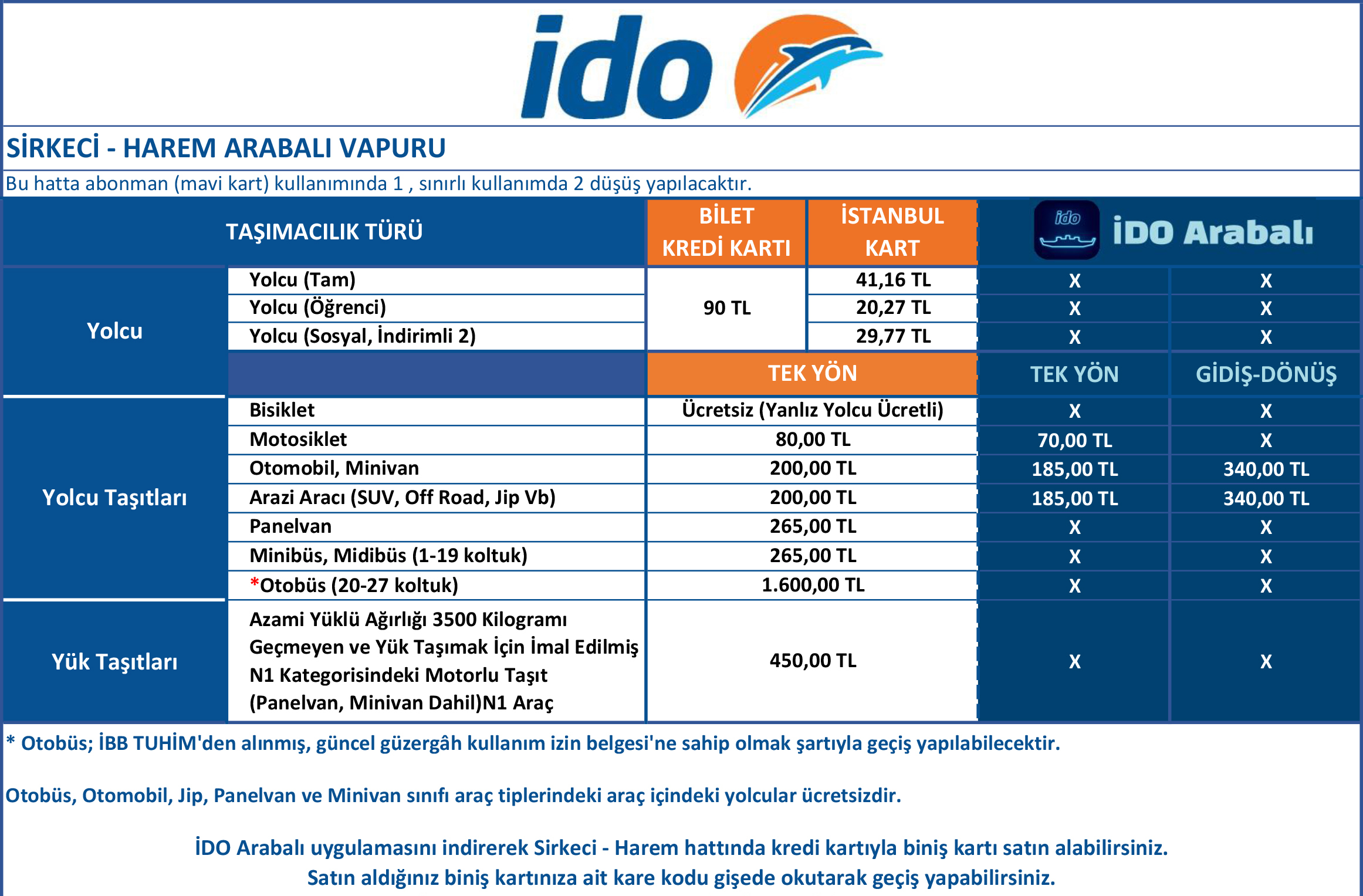 Not: Bilgiler 2026 yılında İDO Arabalı ve Şehir Hatları A.Ş. tarafından yayınlanmıştır.